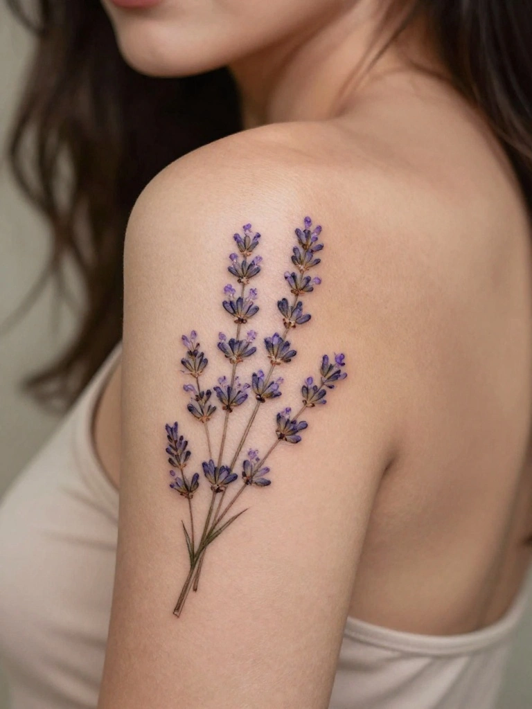 Think about how you want this tattoo to flow along your shoulder. You can opt for a single sprig or a small bouquet, allowing for flexibility in design. This tattoo not only looks lovely but also serves as a gentle reminder of relaxation and serenity.