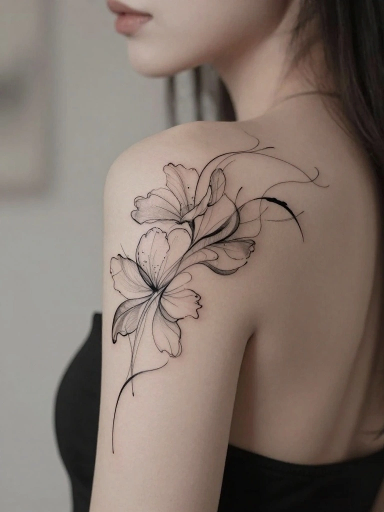 If you appreciate modern art, an abstract floral line tattoo might be your perfect fit. This design elegantly merges floral elements with minimalistic lines, adding a trendy flair to your shoulder without being overwhelming.
