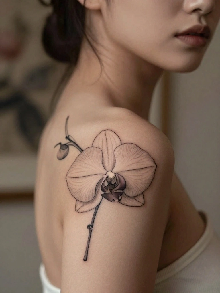 An orchid tattoo on your shoulder can become a lovely reminder of your strength and elegance.