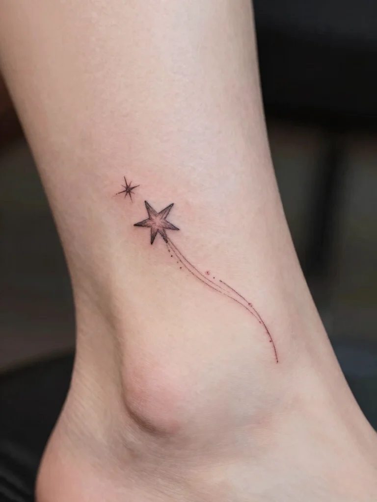 Tiny shooting stars prove that small star tattoos spark big magic. Place them on your wrist or ankle for easy, everyday charm—minimalist star tattoos that feel personal and effortless.