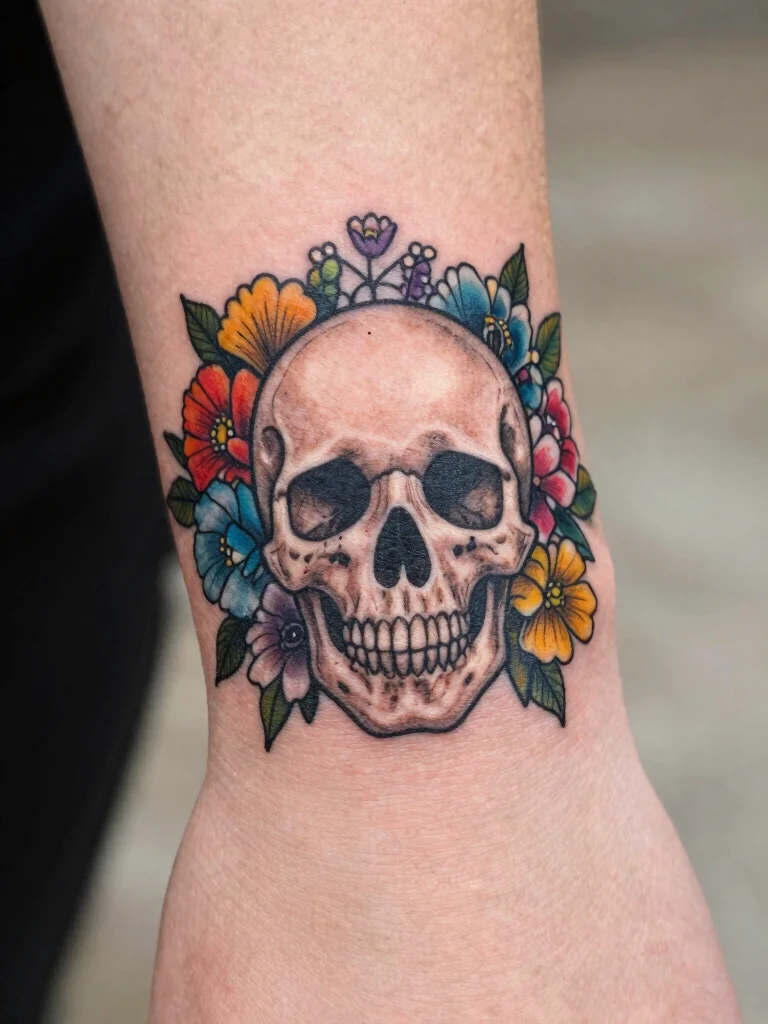 The small skull tattoo offers a bold representation of life and death, beautifully infused with flowers to signify beauty amid transience. This juxtaposition creates a striking effect, blending strength with softness in a unique way.