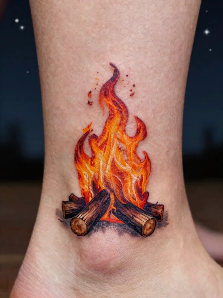 The bonfire tattoo symbolizes warmth, friendship, and community, perfect for those who cherish memories around the fire. This cozy design connects with storytelling and shared experiences under the stars.