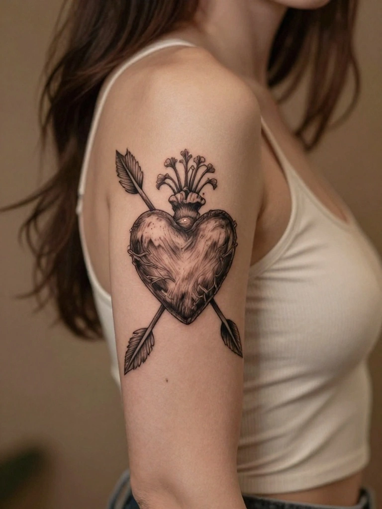 The rustic heart with an arrow tattoo beautifully expresses love and passion, particularly for those who embrace the cowboy spirit. This design merges tradition with emotion, telling a story of adventure and romance.