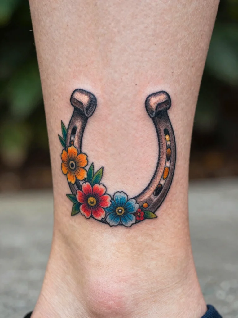 A horseshoe tattoo is a classic symbol of good luck, and when paired with flowers, it creates a beautiful contrast between ruggedness and femininity. This design allows for personal touches, making it uniquely yours with flowers that hold special meaning.
