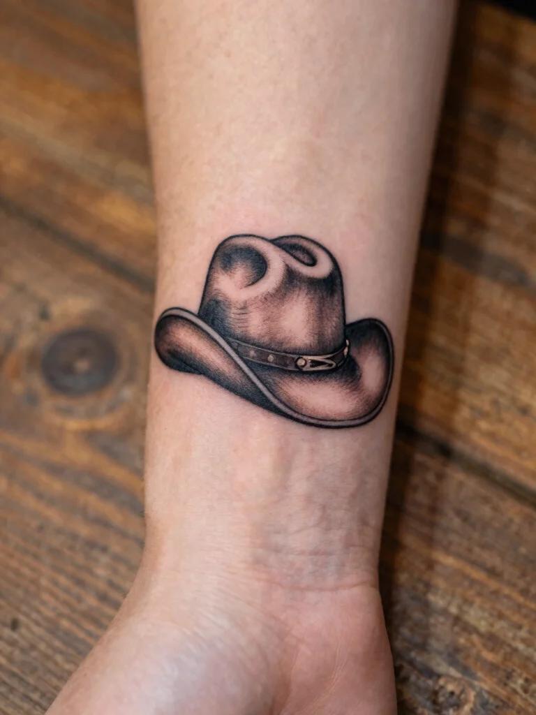 The small cowboy hat tattoo is a classic nod to western culture, symbolizing your love for the cowboy lifestyle. This charming design can be done in various sizes, but a small version offers a subtle yet stylish touch.