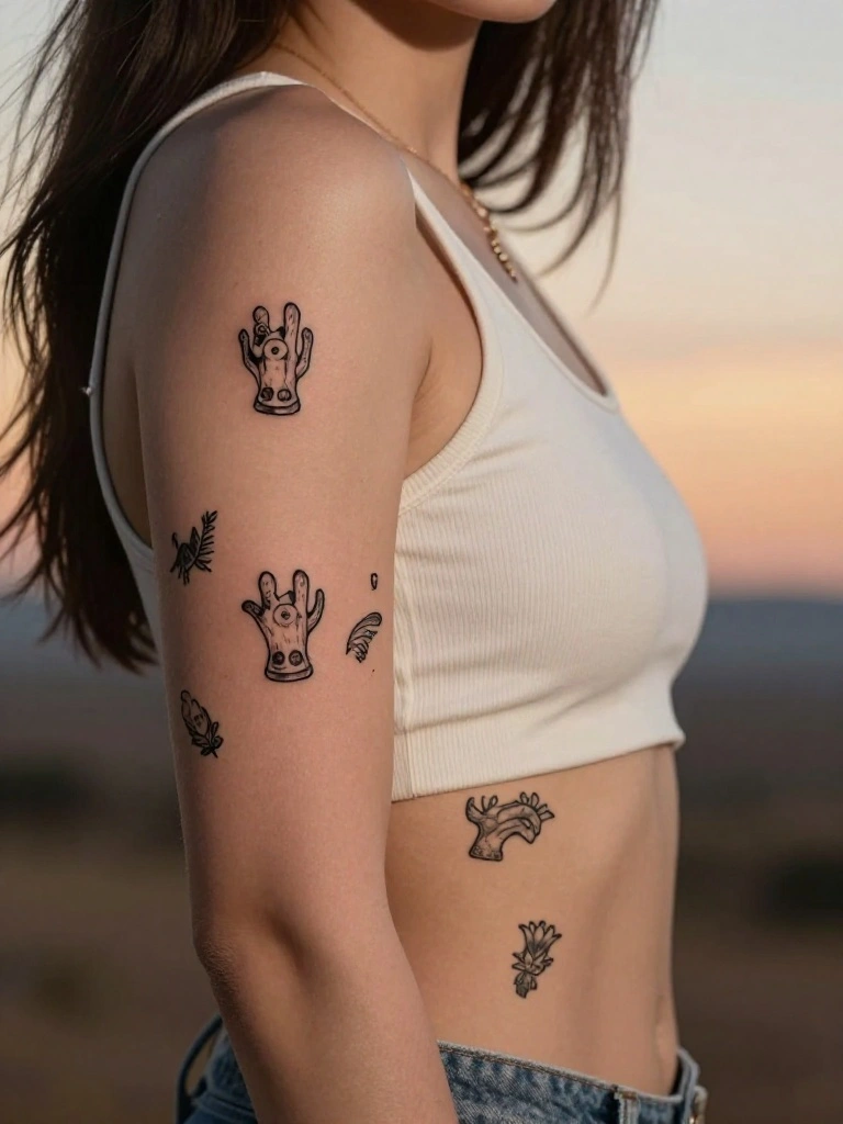 For a rustic vibe, small western tattoos blend delicate line work with symbolic imagery. Try a tiny horseshoe with a dainty floral accent, a minimalist cactus, or a boot wrapped in vines. These options fit under western tattoo designs and minimalist western tattoos. For placement, consider the inner wrist, behind the ear, or ankle for a subtle, chic look. Bring reference ideas from the article’s list of 14 to nail the rustic ink ideas feel.