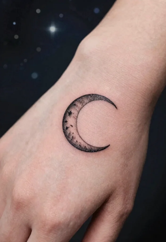 Do you feel a connection to the night sky? A small crescent moon tattoo on your hand beautifully embodies mystery and allure. Ideal for those drawn to the enigmatic, this design symbolizes change and personal growth, making it a powerful choice.