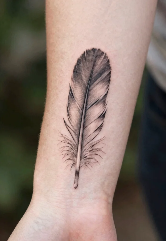Feather tattoos can be stylized in many ways, from simple outlines to intricate details mimicking the softness of a real feather.
