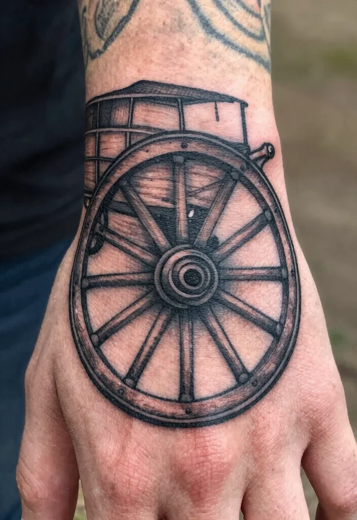 A vintage wagon wheel tattoo symbolizes journey and adventure, reflecting the spirit of the old west where exploration was a way of life. This tattoo can be designed simply or made intricate with personal elements like maps or arrows indicating different directions.