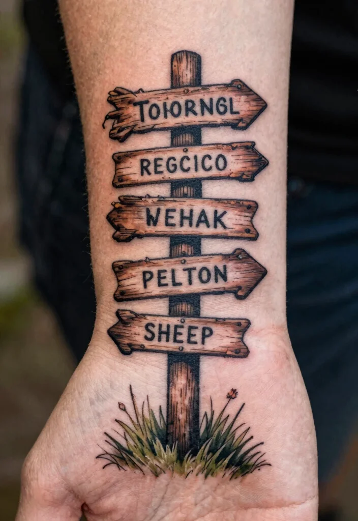 A rustic trail sign tattoo can represent direction and purpose, often depicted with arrows pointing toward destinations. These tattoos symbolize life choices and adventures, inviting you to reflect on your journey. You can personalize the design with locations that hold special meaning to you, enhancing its narrative.