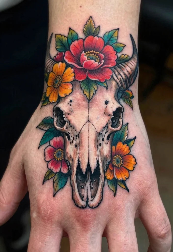To add depth, consider contrasting hard skull features with vibrant flower colors. Ideal placements for this tattoo include the back of the hand or wrist, ensuring maximum visual impact.