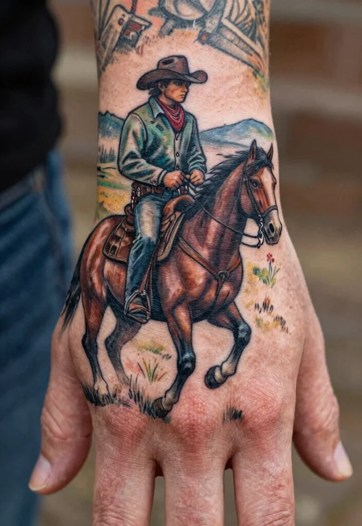 When designing, use a variety of colors and shading techniques to bring the scene to life, ensuring each element is distinct yet harmonious. Ideal placements include the back of the hand or as a larger piece on the wrist, perfect for those who feel a deep connection to the cowboy spirit.