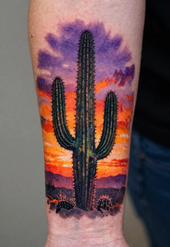 If you’re drawn to the rugged beauty of the west, a cactus tattoo could be the perfect choice for you. This design, featuring a cactus silhouette against a breathtaking sunset, symbolizes resilience and endurance, capturing the essence of the western landscape. You can choose a minimalist approach or a detailed scene that includes a desert backdrop for added depth.