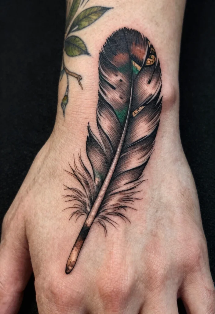Consider personalizing this tattoo by incorporating a name or meaningful date within the feather’s quill. Its graceful form looks stunning when placed on the side of your hand or wrapping around your wrist.