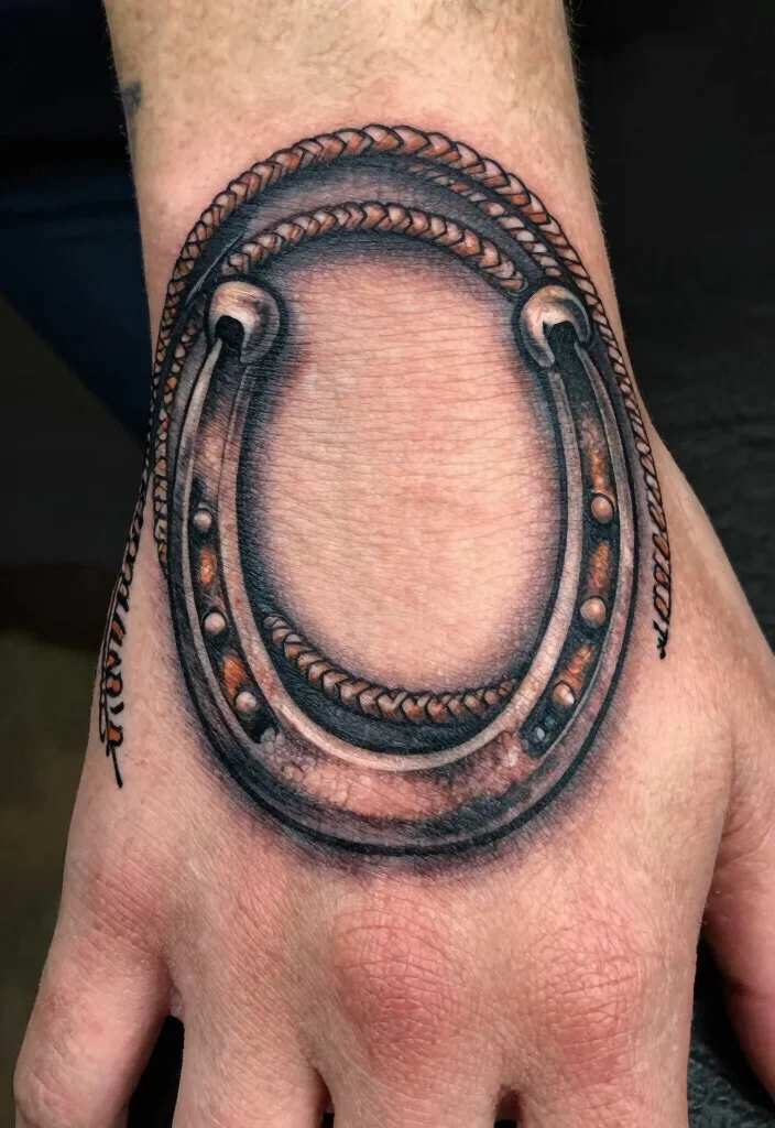 A tattoo combining a lasso and horseshoe creates a dynamic representation of cowboy life. This design symbolizes adventure and tenacity, perfectly capturing the essence of the cowboy spirit. By designing the rope to look three-dimensional as it wraps around the horseshoe, you add a sense of movement to the piece.