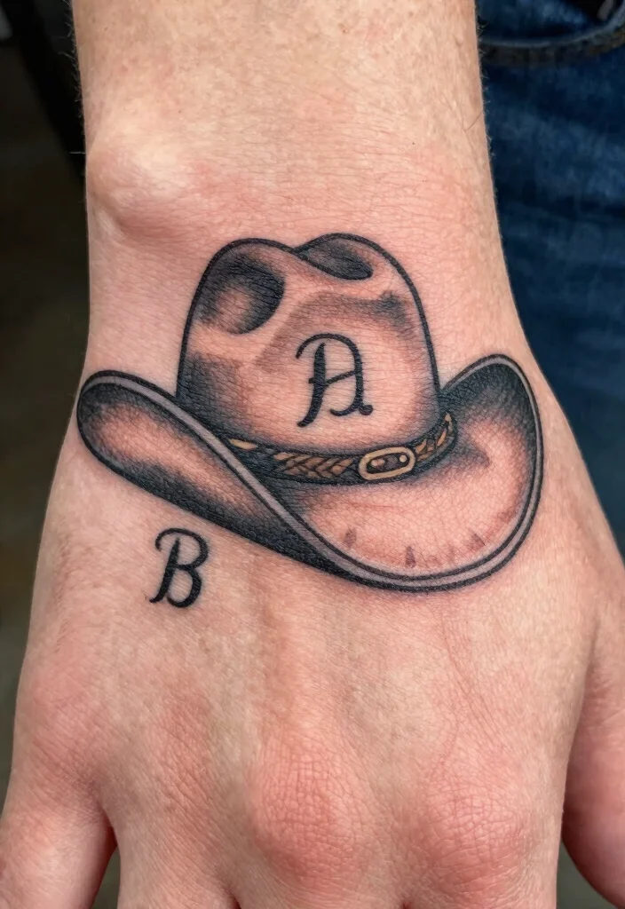 A cowboy hat tattoo symbolizes individuality and your connection to the cowboy lifestyle. By incorporating personal initials or small symbols like a lasso, you can create a unique and meaningful design. This tattoo can be rendered simply or made bolder with shading or decorative elements.