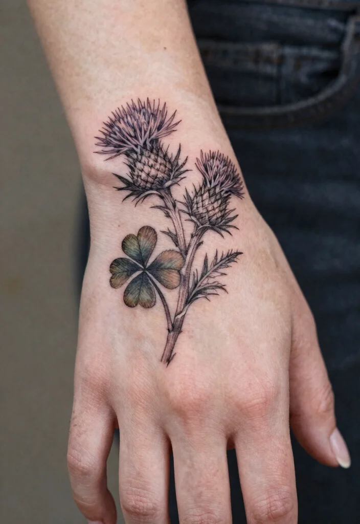 Witchy hand tattoos remind you that protection can wear beauty on your skin. A delicate thistle and clover pairing keeps luck close and strength closer—best in fine line for delicate vibes or bold ink for a stronger statement along your fingers.