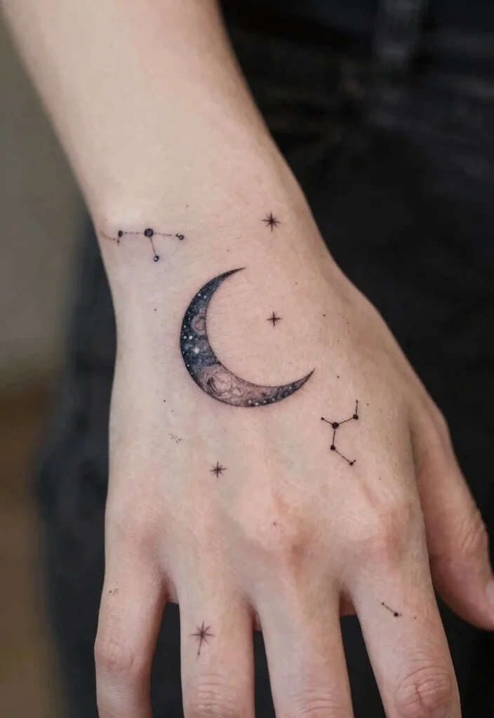 A tattoo inspired by a starry night sky can reflect dreams, inspiration, and guidance. This design evokes a sense of wonder about the universe. Imagine tiny stars and constellations scattered elegantly across your hand or fingers, perhaps with a crescent moon in the backdrop. This tattoo can be designed in a minimalist style with simple dots or detailed with swirling galaxies and shooting stars.
