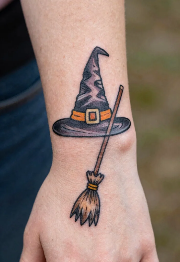 A tattoo featuring a witch’s hat and broom is a whimsical representation of witchcraft. This design embodies playful magic, adding a lighthearted touch to your body art. Imagine a small, stylish witch hat perched atop your finger, paired with a broom that elegantly wraps around your wrist.