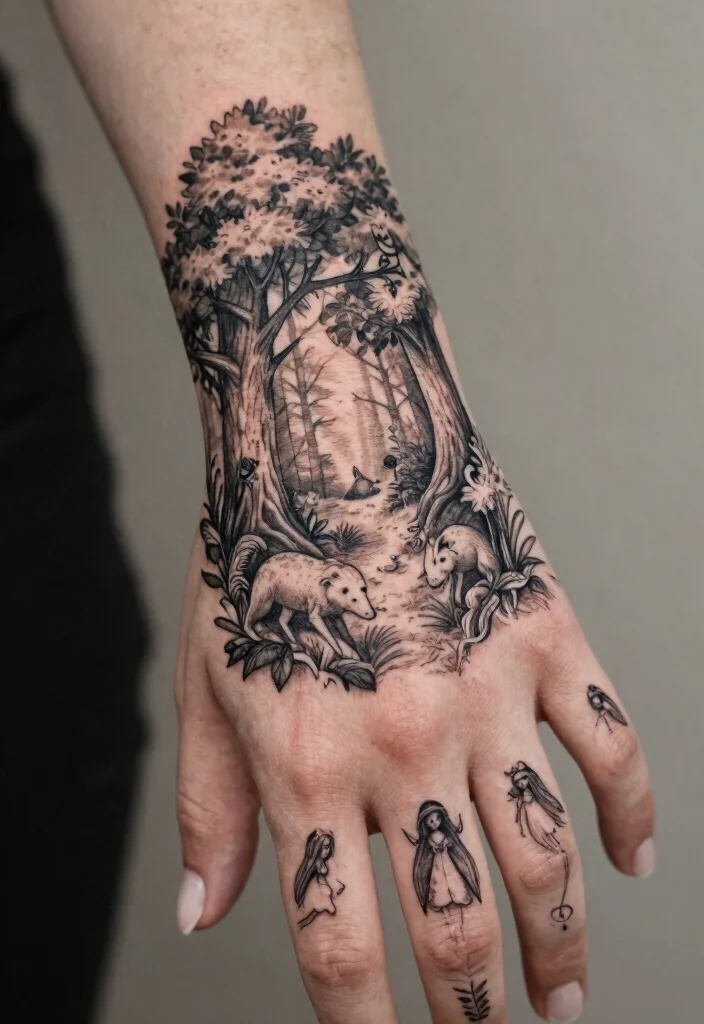 An enchanted forest tattoo symbolizes adventure, mystery, and a deep connection to nature. This design evokes feelings of wanderlust and exploration. Imagine a delicate forest scene inked along your forearm or hand, featuring trees, animals, and perhaps hidden fairies among the foliage.