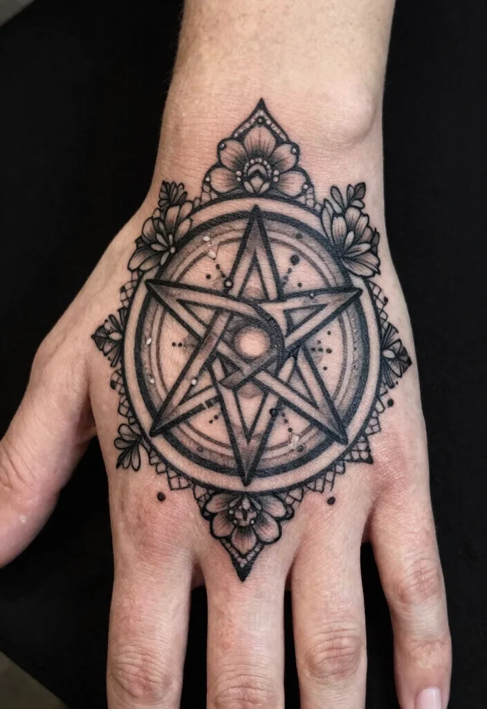 The pentacle serves as a powerful symbol in witchcraft, embodying the five elements: earth, air, fire, water, and spirit. A hand tattoo featuring a pentacle can boldly express your magical beliefs and practices. Imagine a pentacle prominently inked on your palm or hand, potentially adorned with floral designs or intertwining vines that add a touch of nature.
