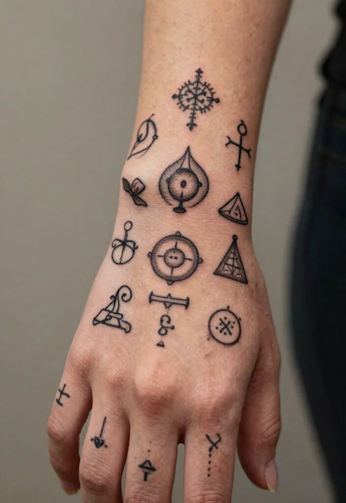 Absolutely. Symbols carry power in occult tattoo art. Moon phase designs symbolize cycles and growth, while the pentacle is a classic protective emblem. Sigils can encode personal intentions, and runes bring ancient meanings (like protection or transformation). Other mystical options include the triquetra for unity, or a simple spiral representing evolution. When choosing, pick a symbol that resonates personally and complements the rest of your magical tattoo designs so your hand tattoo inspiration reflects you.