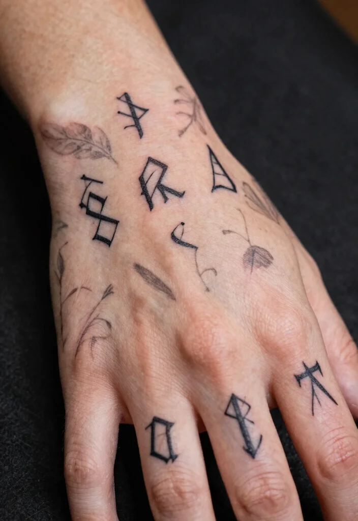 Runes are ancient symbols with rich meanings, embodying various concepts and energies. A hand tattoo featuring runes can evoke a sense of history and magic in your body art. Picture a design that elegantly incorporates significant runes along your forearm or the side of your hand, each symbol representing themes like protection, love, or wisdom.