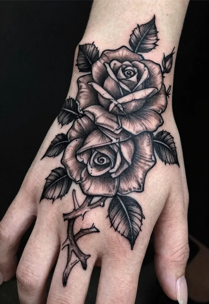Roses symbolize beauty but also represent the darker, mysterious aspects of nature. A hand tattoo featuring gothic roses is perfect for those who appreciate the beauty within darkness. Imagine bold black roses entwined with thorns tattooed elegantly along your fingers or wrist, creating a striking statement piece.