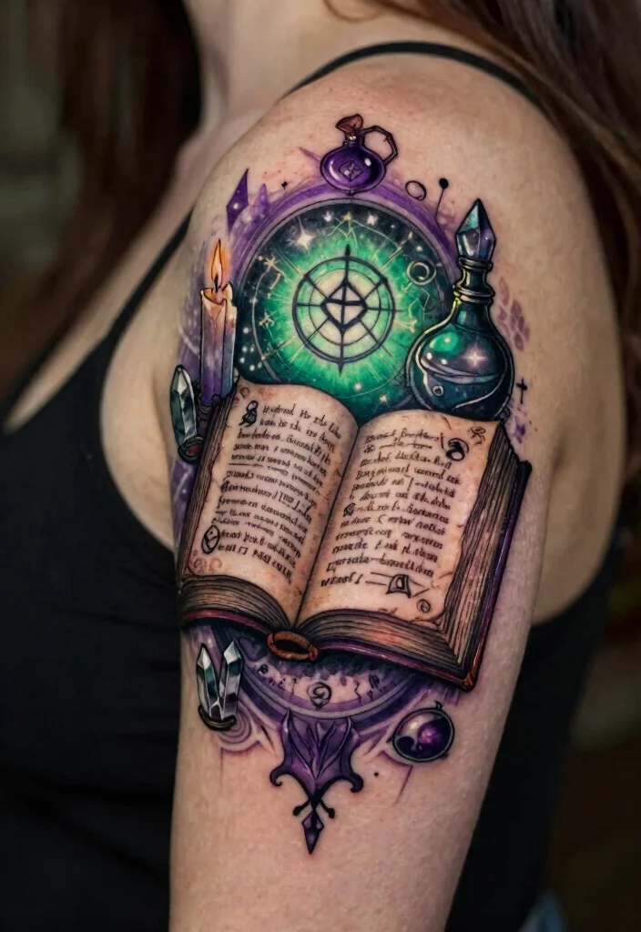 A tattoo inspired by the imagery of a witch’s spellbook symbolizes knowledge, curiosity, and the pursuit of wisdom. Picture an open spellbook inked on your forearm or hand, filled with magical symbols, potions, and enchanting illustrations. This tattoo design can come alive with intricate details, from the pages to surrounding elements like candles and crystals.