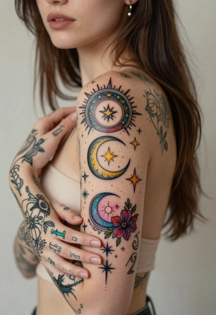 This can be designed in fine lines for a minimalistic look or rich with details for vibrancy. Adding elements like stars or moonlight enhances the magical quality, creating an ethereal atmosphere.